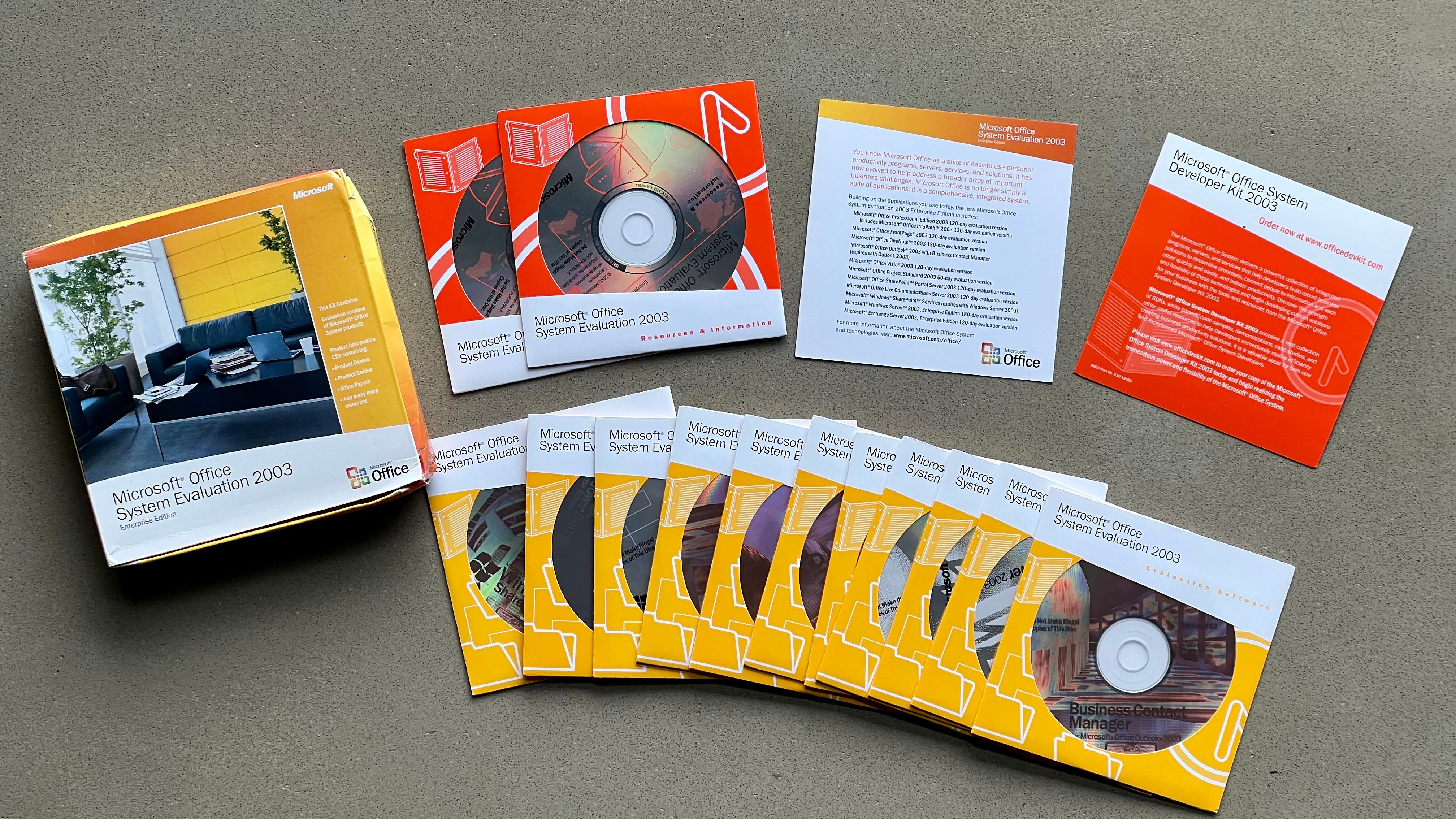 Breadth was an understatement. The sheer volume, or mass, of software being released as one product at one time was overwhelming for customers and the press. It wasn’t just that it was overwhelming in quantity, but the features individually were so deep, so complex, that few could really understand them well-enough to provide detailed reviews. The product guide we distributed to reviewers and the press was 170 pages, a book! The Microsoft Office System Evaluation 2003 Enterprise Edition kit consisted of 11 CDROM discs and two discs filled with various technical and overview documents, demonstration videos, and an entire disc-based website of Macromedia Flash content. It seems easy to make fun of this today, but then one look at the web site for Office 365 and I guess one could long for the finiteness of a bundle of CDROM discs.