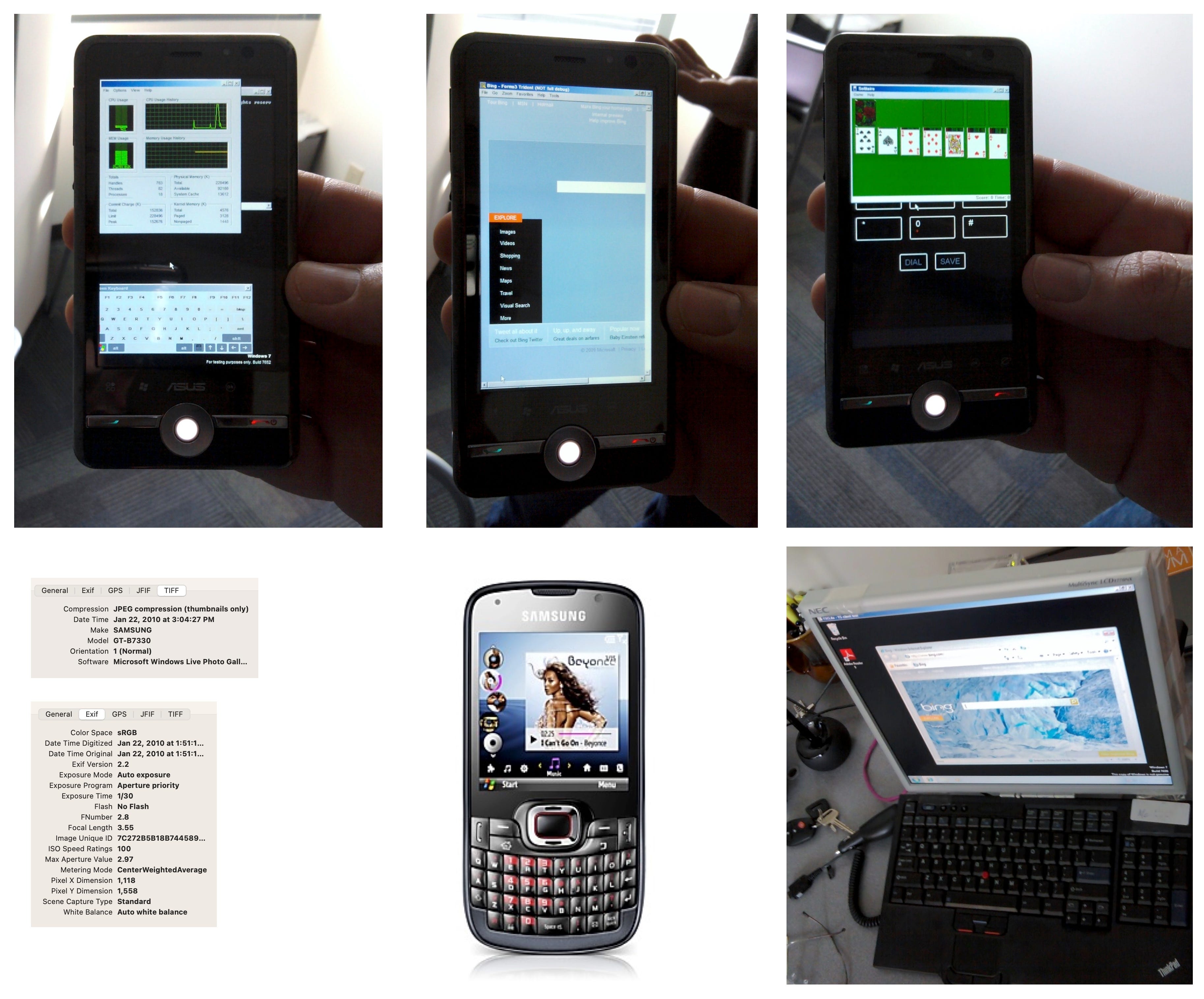 I took some photos of the screens with my Samsung Windows Mobile 6.5 phone. Two years later I used them in a Windows on ARM blog post described below, intentionally leaving the original embedded timestamps of the afternoon January 22, 2010, which the internet quickly discovered. That was just after the iPad launch and, for those who cared, it let them know we were working on tablets and ARM much longer than thought and were clearly serious. I know that hardly matters in the scheme of things, but it always made me feel better when we were accused of following in the wake of Apple.